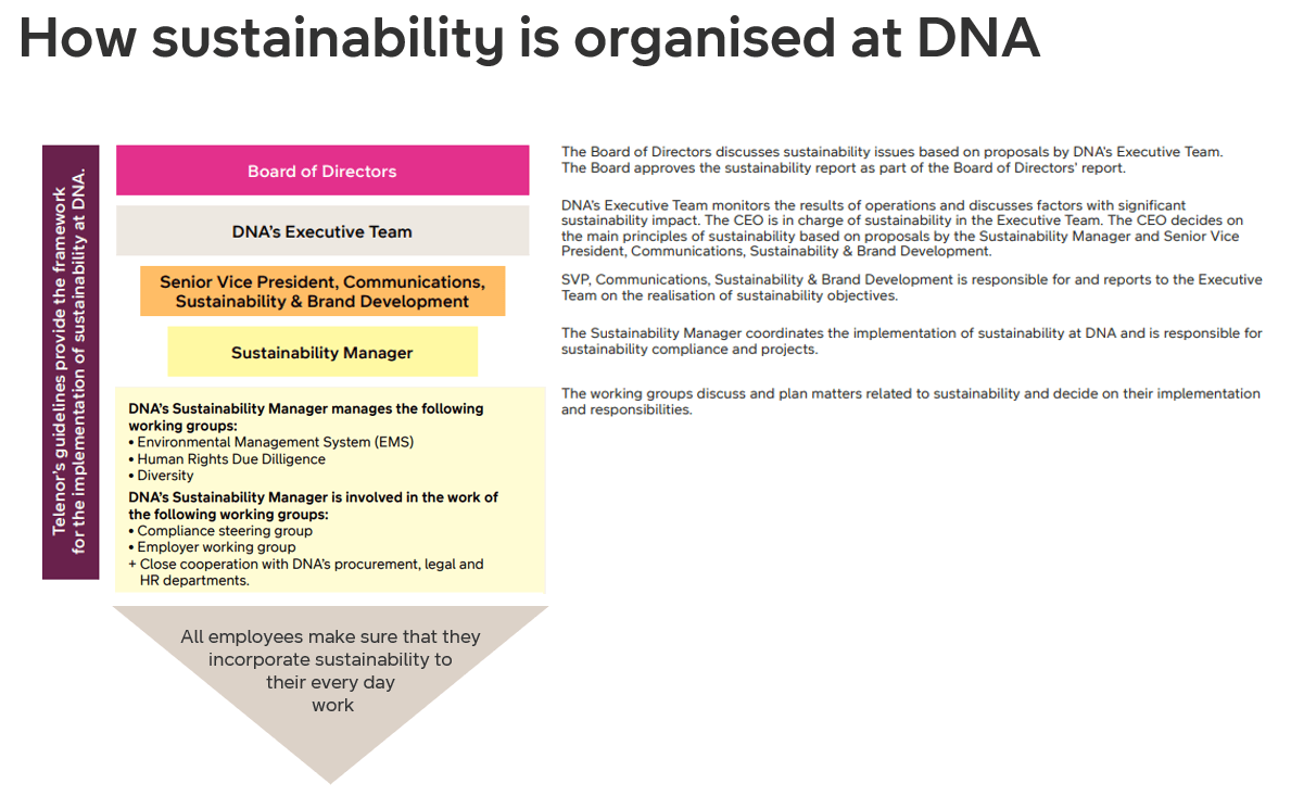 The CEO is in charge of corporate responsibility in the Executive Team. The CEO decides on the main principles of corporate responsibility based on proposals by the Sustainability Manager and Vice President, Corporate Communications. The body that ultimately accounts for DNA’s corporate responsibility is the Board of Directors.